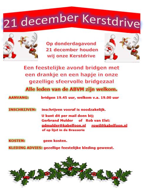 Op donderdag 21 december houden we onze Kerstdrive, waarbij we in een Kerststemming gezellig bridgen met een hapje en een drankje.